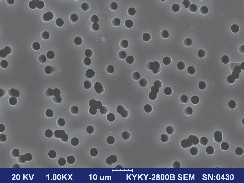 微孔隨機分布,孔徑精確、均一,形狀規則,孔密度104~1011/cm2。