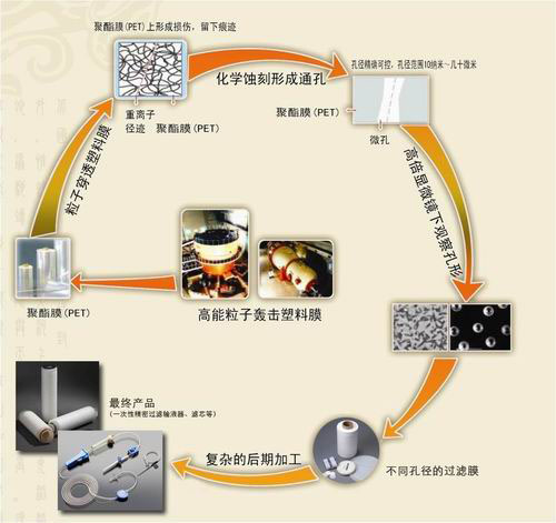 重離子微孔膜是一種新型的過濾膜。它的濾孔幾何形狀規則,孔徑均勻,基本是圓柱形的直通孔,過濾時大于孔徑的微粒被截留在濾膜表面,適宜橫向流過濾或反沖,以提高濾膜壽命。又由于濾膜本身是電介質薄膜,就不存在濾膜本身對濾液的污染,所以是精密過濾和篩分粒子的理想工具。